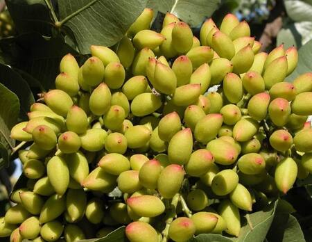 - El fruto —el pistacho que conocemos— es una drupa que madura a fines del verano. Cuando está listo, su cáscara se abre sola para dejar ver su interior comestible.