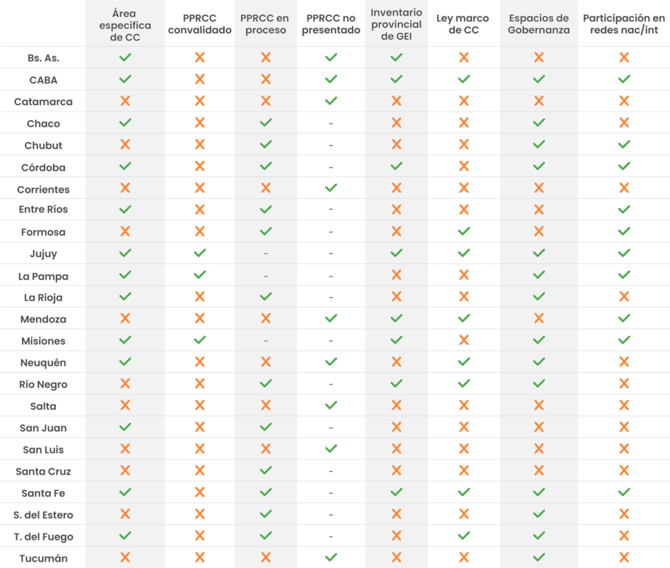 En tanto, el Informe sobre Compromisos Climáticos Provinciales, elaborado por Sustentabilidad Sin Fronteras (SSF) revela que el 54% de las provincias cuentan con áreas de gobierno específicas de cambio climático, pero solo 7 elaboraron inventarios propios de gases de efecto invernadero: Buenos Aires, Córdoba, Jujuy, Mendoza, Misiones, Río Negro y Santa Fe. Y 8 jurisdicciones cuentan con una ley marco de cambio climático (CABA, Santa Fe, Jujuy, Neuquén, Mendoza, Río Negro, Tierra del Fuego y Formosa).