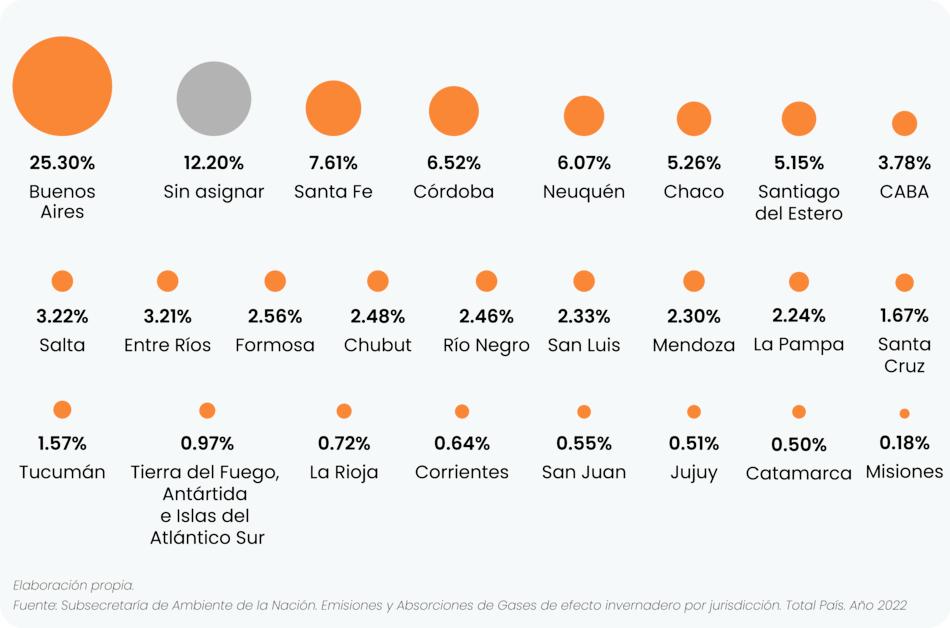 El informe de SSF también muestra que Buenos Aires concentra el 34% de las emisiones de gases de efecto invernadero nacionales, seguido por un 12% de emisiones sin asignar, y luego un 7.61% de Santa Fe y 6.52% de Córdoba.