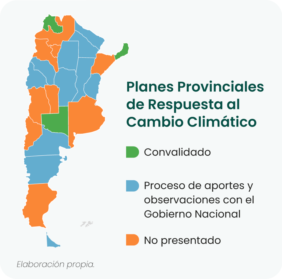 De acuerdo al informe de FARN “Gobernanza climática federal en Argentina: balance y perspectivas de la Ley 27.520”, sólo tres provincias, Jujuy, La Pampa y Misiones, lograron la convalidación nacional de sus Planes Provinciales de Respuesta al Cambio Climático. Estos planes incluyen diagnósticos locales, metas de reducción de emisiones y medidas sectoriales frente a inundaciones, incendios y sequías.