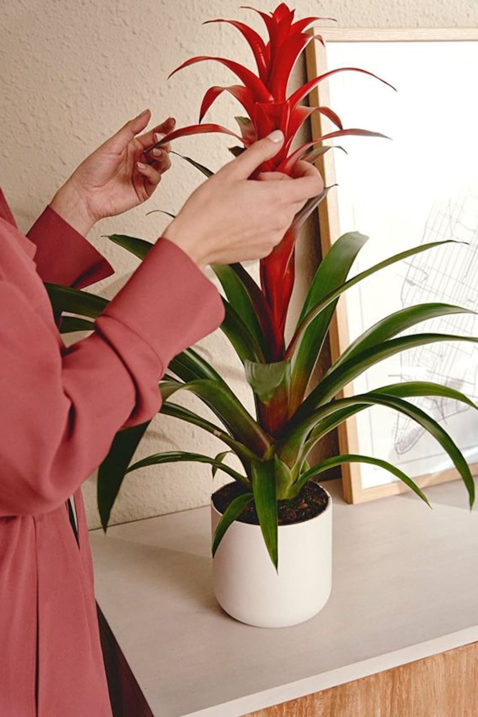 Ideal para sumar un toque de color intenso, la guzmania despliega una bráctea roja que se mantiene firme durante meses, incluso en pleno verano.