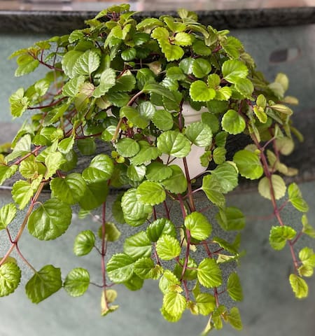Sus hojas redondeadas y carnosas aportan una sensación de frescura, y su forma colgante la convierte en una excelente opción para macetas altas, estantes o balcones.