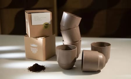 Así nació la firma Etimo, que desarrolla biomateriales con residuos gastronómicos y creó una “taza-borra” a partir de la borra de café. A partir de convenios con cadenas de cafeterías como Starbucks, Full, Cabrales y Evaristo, la firma retira los residuos, produce los biomateriales y los convierte en tazas reutilizables que al final de su vida útil se pueden compostar, aportando nutrientes al suelo.