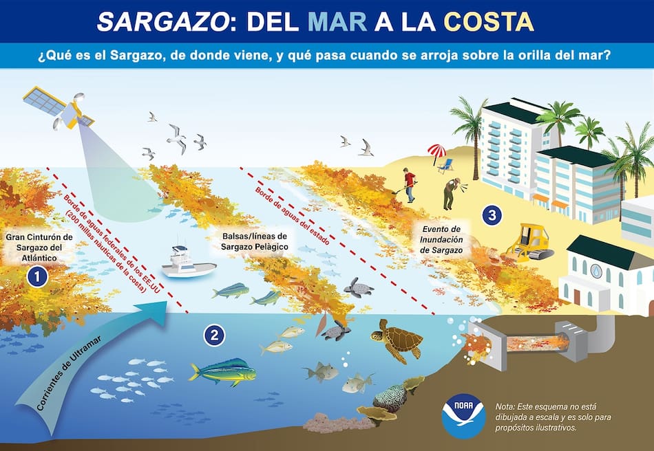 En cantidades moderadas, el sargazo cumple una función ecológica al servir de refugio y alimento para diversas especies marinas. Sin embargo, cuando se acumula en grandes masas y se desplaza a lo largo del océano, puede generar impactos ambientales y económicos en varios países.