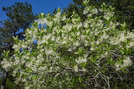 Entre ellas, se destaca el árbol de nieve o laurel de nieve (Chionanthus virginicus), una especie de tamaño pequeño a mediano conocida por su llamativa floración. Puede cultivarse tanto en el suelo como en maceta, lo que lo convierte en una buena opción para balcones, patios o terrazas.