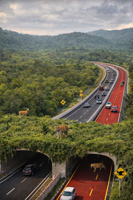 Para reducir atropellamientos y evitar que el hábitat quede fragmentado, se incorporaron soluciones específicas como ecoductos —puentes verdes cubiertos de vegetación— y túneles subterráneos. Estas estructuras permiten que especies como tigres, leopardos, ciervos y otros animales crucen sin exponerse al tránsito vehicular.