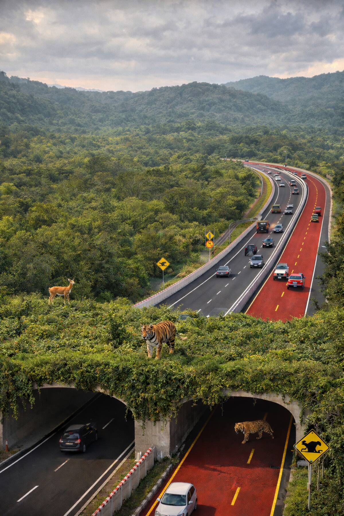 Para reducir atropellamientos y evitar que el hábitat quede fragmentado, se incorporaron soluciones específicas como ecoductos —puentes verdes cubiertos de vegetación— y túneles subterráneos. Estas estructuras permiten que especies como tigres, leopardos, ciervos y otros animales crucen sin exponerse al tránsito vehicular.