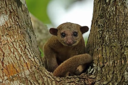 Su estilo de vida arborícola explica por qué rara vez es visto en estado salvaje. Entre las ramas, este animal despliega una notable capacidad de movimiento gracias a varias adaptaciones físicas: una cola prensil que puede igualar la longitud de su cuerpo y le permite sujetarse como si fuera una quinta extremidad, tobillos capaces de rotar hasta 180 grados y una gran agilidad para desplazarse entre árboles.