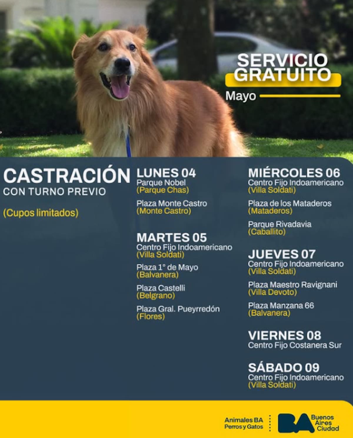 El Gobierno de la Ciudad de Buenos Aires, a través del programa Animales BA, ofrece durante mayo un nuevo operativo de castración gratuita para perros y gatos. El servicio se realiza con turno previo y cuenta con cupos limitados, por lo que se recomienda reservar con anticipación.