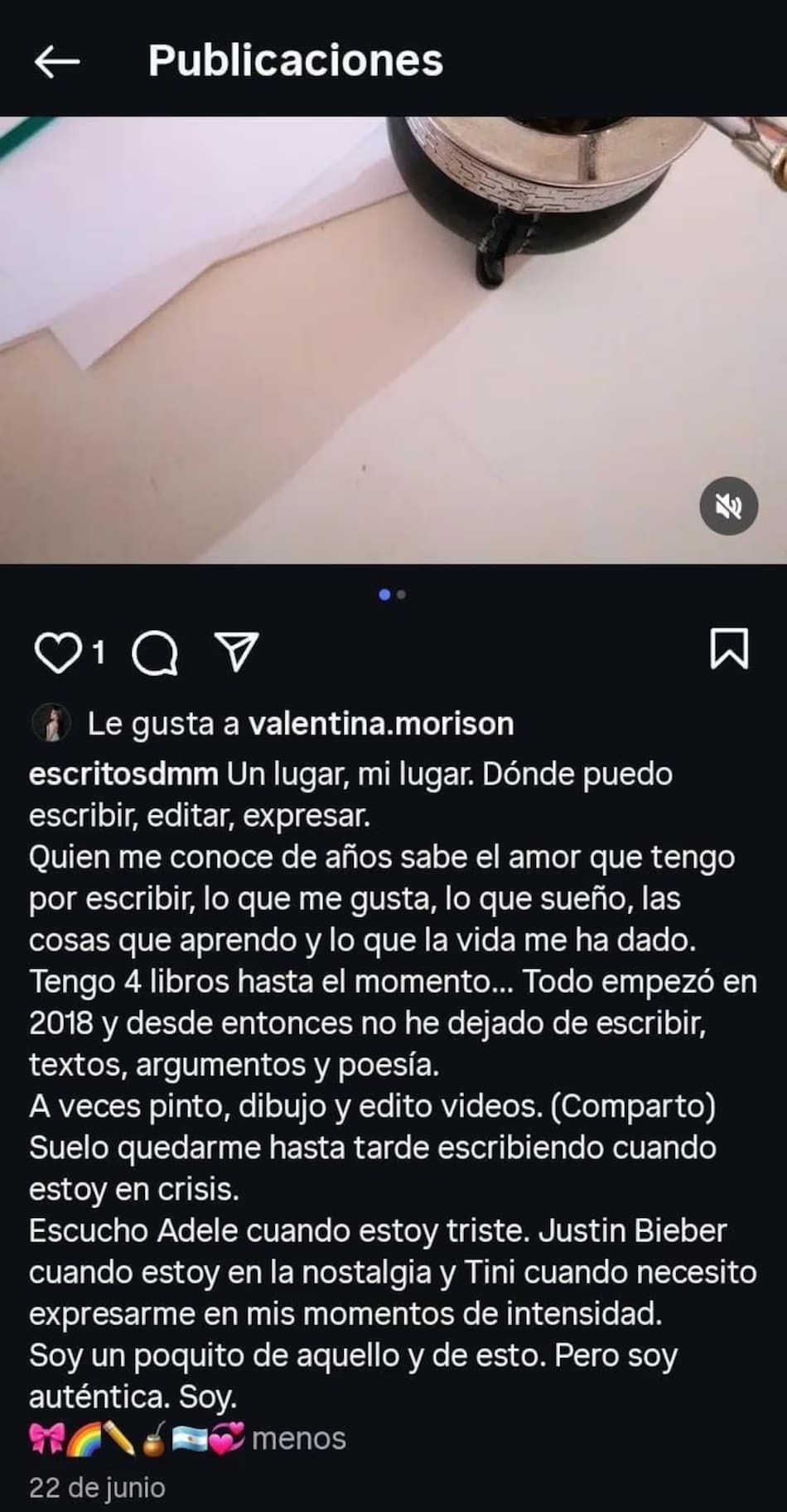La joven también mostraba en redes su costado más creativo y sensible. “Tengo cuatro libros hasta el momento”, escribió en junio, junto a una descripción de su mundo interior y sus gustos musicales. “Escucho Adele cuando estoy triste, Justin Bieber cuando estoy en la nostalgia y Tini cuando necesito expresarme”.