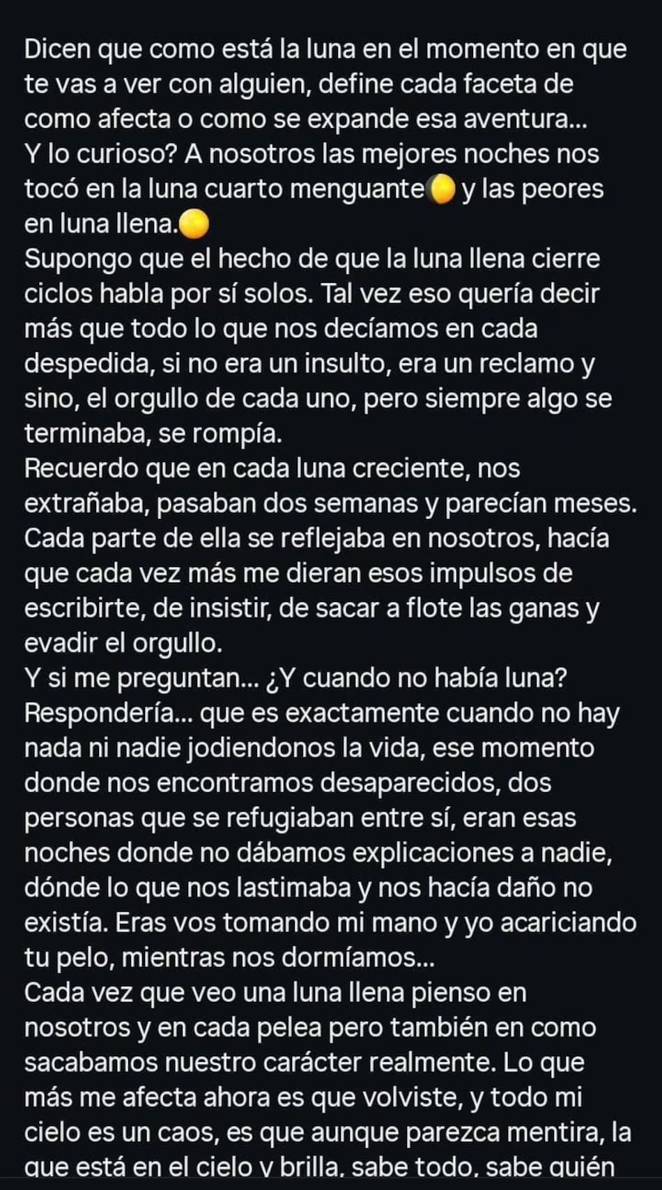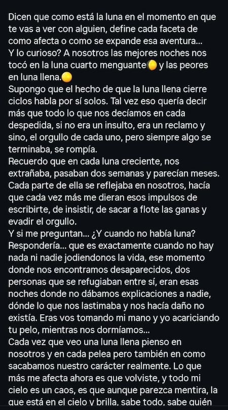 En otro de sus posteos, expresó: “Siempre me dijiste que éramos muy diferentes, y cuánta razón tenías (...). Jamás hubiera querido lastimarte, ni siquiera dejar que me rogaras”.