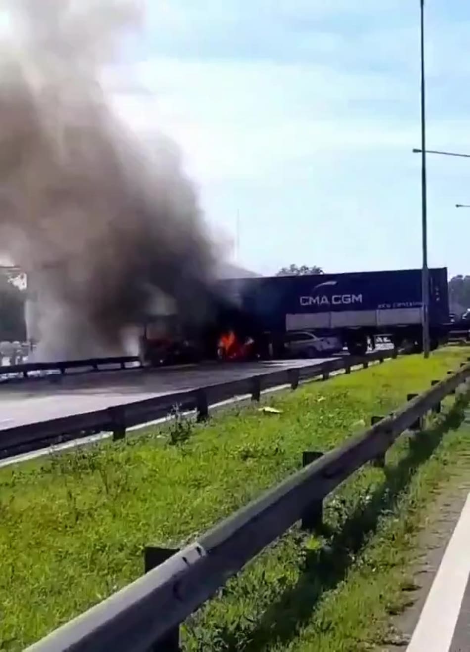 La magnitud del impacto generó una columna de humo visible a varios kilómetros. Además, el colapso total del tránsito en ambos sentidos impidió trabajar a los Bomberos de manera rápida.
