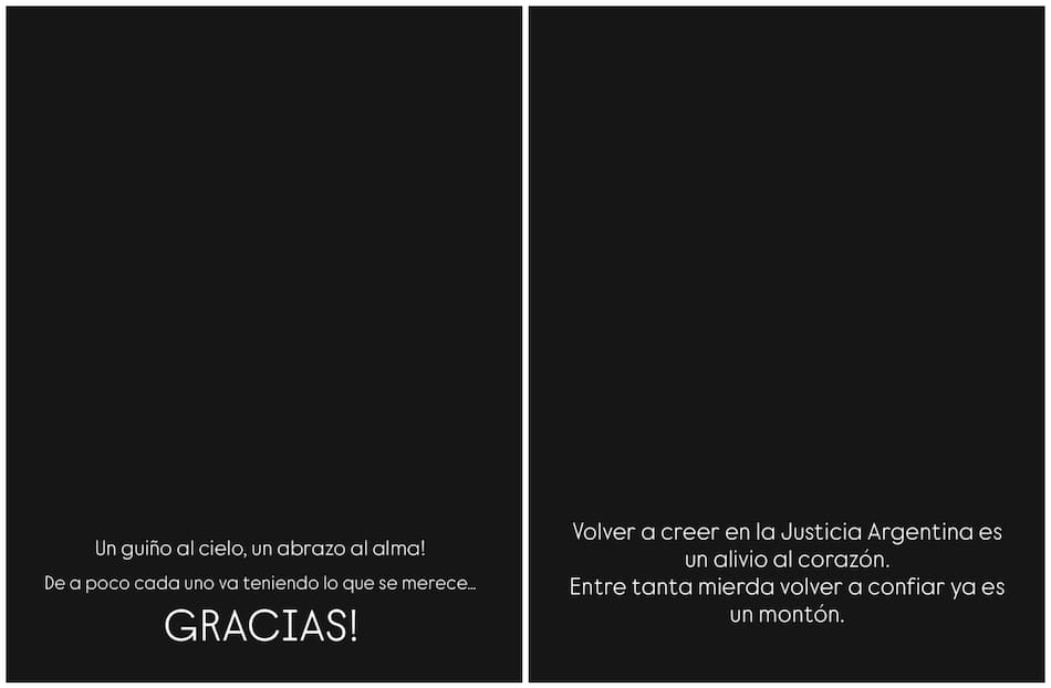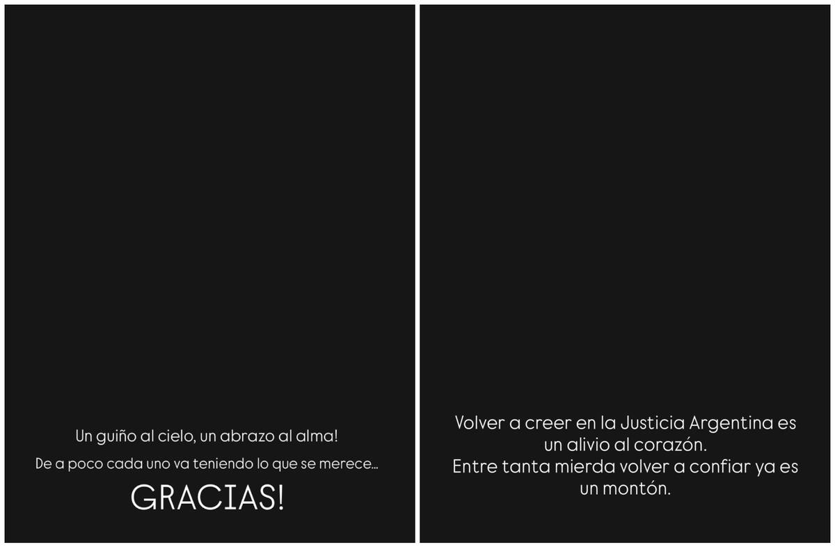 Por otro lado, Gianinna, una de las hijas de Diego Maradona, también se expresó a través de las redes sociales. “Un guiño al cielo, un abrazo al alma. De a poco cada uno va teniendo lo que se merece ¡Gracias!”, expresó en sus historias de Instagram. “Volver a creer en la Justicia argentina es un alivio al corazón. Entre tanta mierd... volver a confiar ya es un montón”, agregó.