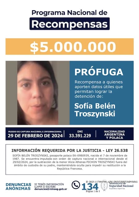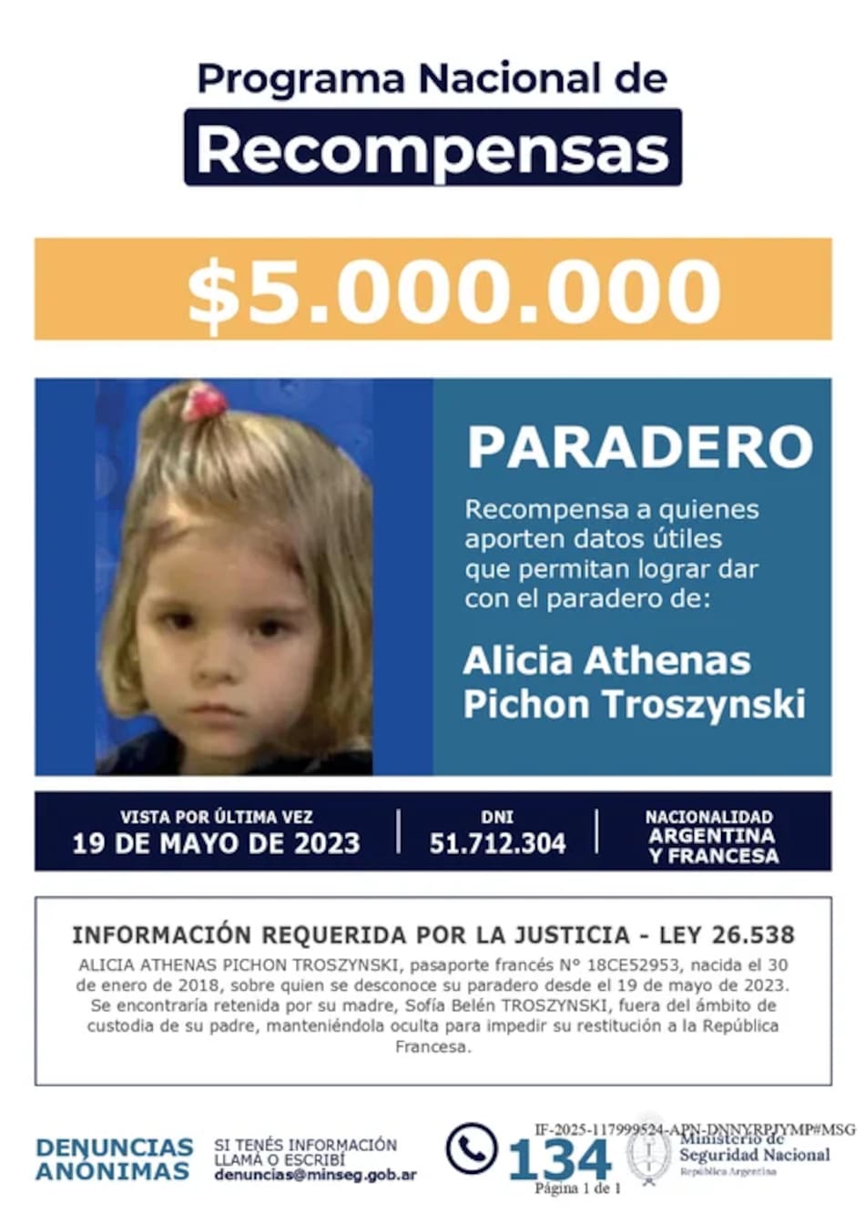El Ministerio de Seguridad Nacional busca el paradero de Alicia Athenas Pichon Troszynski, una niña que fue secuestrada por su madre, identificada como Sofía Belén Troszynski, y quien posee una orden de captura nacional e internacional. Por información del paradero hay recompensa.