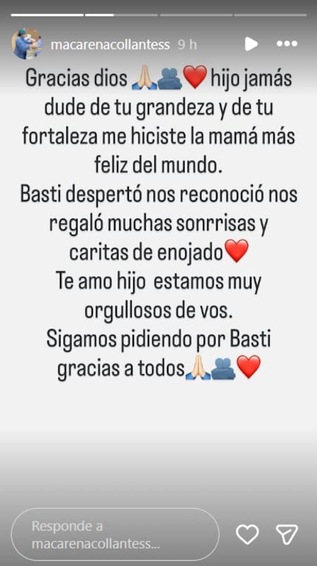 Luego, Collantes remarcó “seguir pidiendo por Basti” y agradeció el apoyo que recibe día a día tras el accidente en Pinamar que sufrió su pequeño.