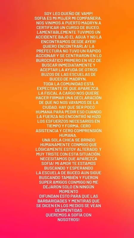 Leo, el novio de la joven, denunció negligencia por parte de las autoridades y pidió ayuda para encontrarla. “Lamentablemente tuvimos un accidente debajo del agua y no la encontramos desde ayer. Quiero encontrarla. La Prefectura no tuvo rápida acción y se centraron en lo burocrático primero en vez de buscar inmediatamente y aceptar la ayuda de otros buzos de la escuela de Madryn”, expresó.