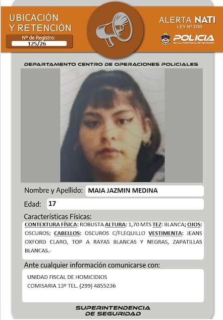 Medina fue descrita de contextura robusta, mide 1,70 metros aproximadamente, tiene tez blanca, cabello oscuro con flequillo y ojos oscuros. Al momento de su desaparición vestía un jean claro, tipo Oxford, top a rayas blancas y negras y zapatillas blancas. En este contexto, se activó la “Alerta NATI”, el protocolo neuquino que se pone en marcha en estas situaciones.