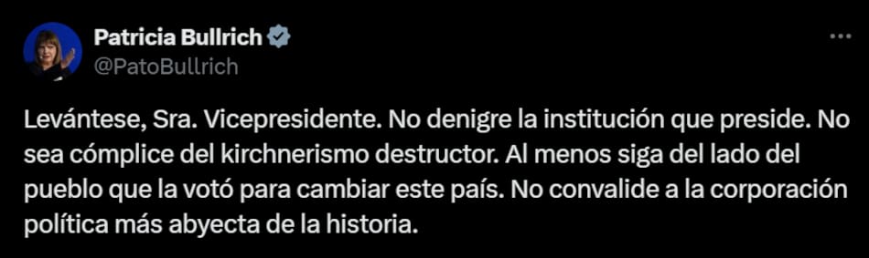 “Levántese. No denigre la institución que preside. No sea cómplice del kirchnerismo destructor. Al menos siga del lado del pueblo que la votó para cambiar este país. No convalide a la corporación política más abyecta de la historia”, señaló Bullrich en X.