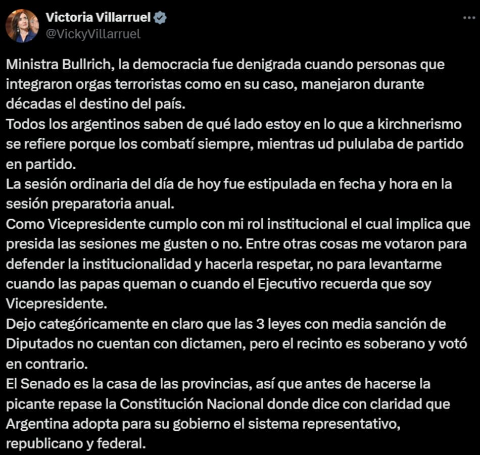 La respuesta de Villarruel llegó luego de que la ministra utilizara sus redes sociales para acusarla de ser “cómplice del kirchnerismo destructor” por habilitar la sesión en la que se iban a tratar proyectos de la oposición que el Gobierno nacional resiste.