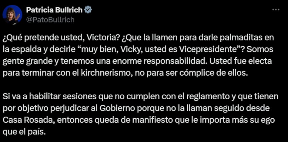 “¿Qué pretende usted, Victoria? ¿Que la llamen para darle palmaditas en la espalda y decirle ‘muy bien, Vicky, usted es Vicepresidente’? Somos gente grande y tenemos una enorme responsabilidad. Usted fue electa para terminar con el kirchnerismo, no para ser cómplice de ellos“, comenzó escribiendo.