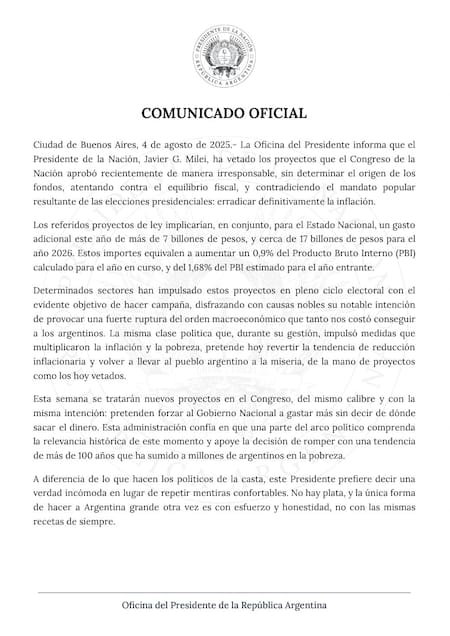 Costo fiscal “exorbitante”: El decreto afirma que los tres proyectos en conjunto implicarían un gasto adicional de más de 7 billones de pesos en 2025 y cerca de 17 billones de pesos en 2026. Sostienen que esto equivale a casi el 1% del PBI para este año y al 1,68% para el próximo, lo que “dificultaría el cumplimiento de las metas fiscales” y pondría en riesgo el equilibrio fiscal, al que califican como “innegociable”.
