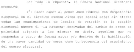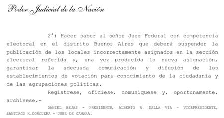 En su resolución, la Cámara consideró necesario revertir la medida para “resguardar el derecho de los electores a conocer adecuadamente la ubicación” de las escuelas y, de esa manera, “promover la mayor participación electoral posible y mitigar el ausentismo”.