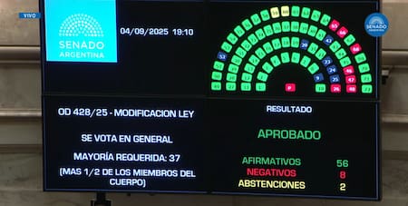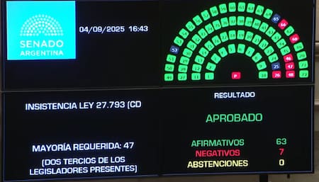 La primera votación terminó con 63 votos afirmativos, 7 negativos y 0 abstenciones. Si bien deberá ser promulgada, se espera que el Gobierno avance con una medida judicial. Para intentar sostener el veto, el oficialismo recibió el apoyo de la senadora del PRO Carmen Álvarez Rivero y Francisco Paoltroni, quien volvió a alinearse por completo con la Casa Rosada.