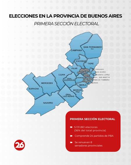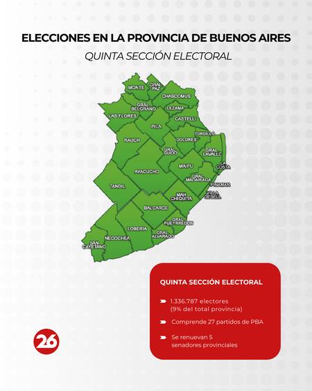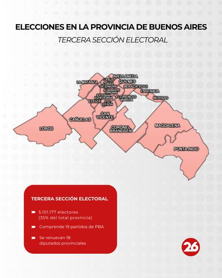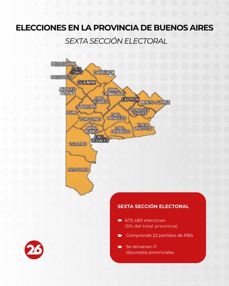 El territorio de la provincia de Buenos Aires abarca una gran extensión, con 135 municipios distribuidos en ocho secciones y un total de 14.376.592 electores a nivel provincial.