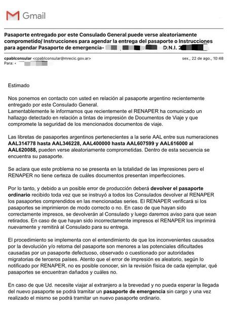 “Lamentablemente, le informamos que recientemente el RENAPER ha comunicado un hallazgo detectado en relación a tintas de impresión de Documentos de Viaje y que compromete la seguridad de los mencionados documentos de viaje. Las libretas de pasaportes argentinos pertenecientes a la serie AAL entre sus numeraciones AAL314778 hasta AAL346228, AAL400000 hasta AAL607599 y AAL616000 al AAL620088, pueden verse aleatoriamente comprometidas. Dentro de esta secuencia se encuentra su pasaporte”, dice uno de los correos electrónicos enviados a los afectados.