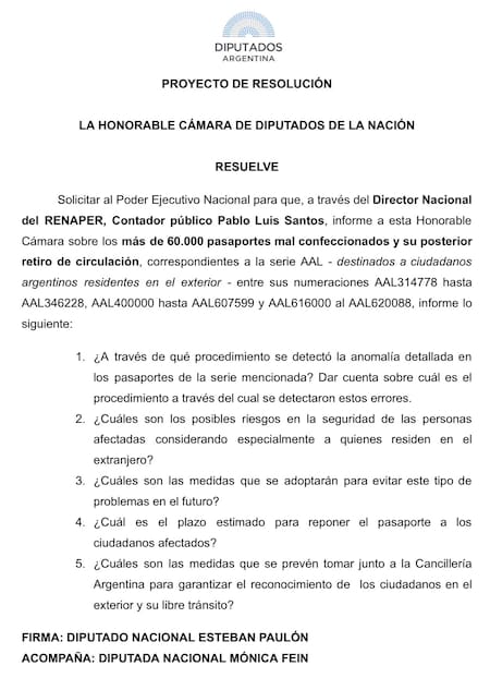 De acuerdo con un pedido de informes presentado por el diputado Esteban Paulón al director nacional del Renaper, Pablo Luis Santos, serían al menos 60.000 los pasaportes defectuosos. Sin embargo, fuentes extraoficiales sostienen que la cifra real podría superar los 200.000.