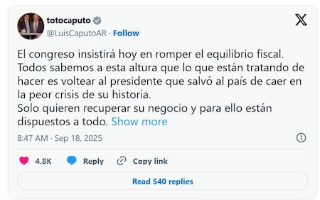 “El congreso insistirá hoy en romper el equilibrio fiscal. Todos sabemos a esta altura que lo que están tratando de hacer es voltear al presidente que salvó al país de caer en la peor crisis de su historia”, señaló Caputo en X.