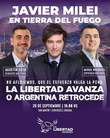 A poco menos de un mes las elecciones legislativas nacionales del 26 de octubre, el jefe de Estado anticipó la visita a la ciudad fueguina: “Nos vemos en Tierra del Fuego”, anunció a través de sus redes sociales. “A no aflojar. A no tirar el esfuerzo a la basura. La Libertad Avanza o la Argentina retrocede. ¡Viva la libertad carajo!”, concluyó.