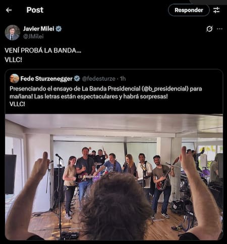 A través de su cuenta de X, el mandatario citó un posteo del ministro de Desregulación y Transformación del Estado, Federico Sturzenegger, quien presencia el ensayo: “VENÍ PROBÁ LA BANDA... VLLC!”, sentenció junto a una imagen en la que se lo ve rodeado de funcionarios y legisladores que lo acompañarán en el escenario.