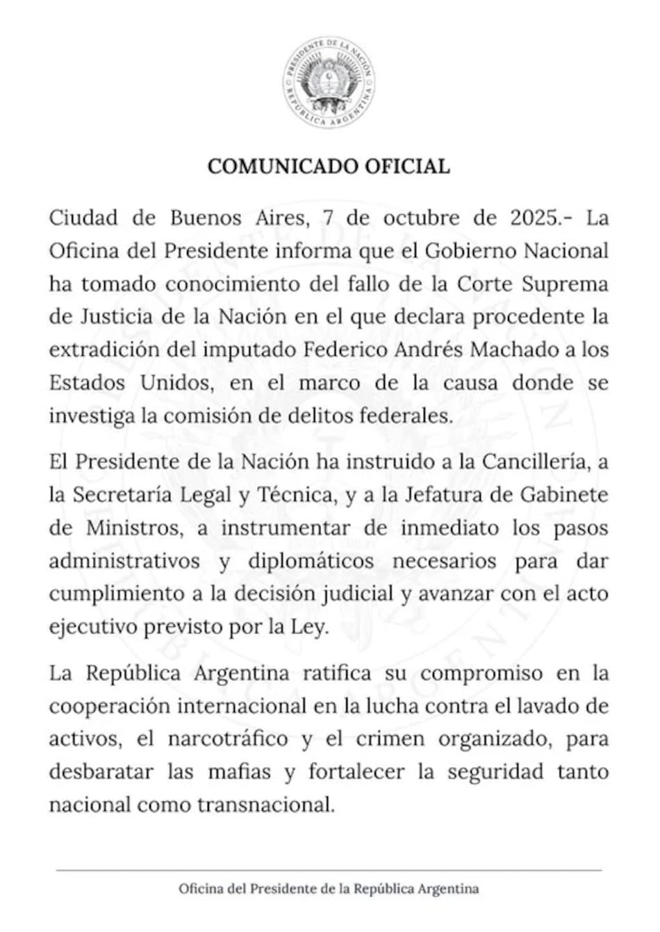 El Gobierno confirmó este martes que cumplirá con el fallo de la Corte Suprema de Justicia que declaró procedente la extradición de Federico Andrés Machado a los Estados Unidos, donde se lo investiga por delitos federales.