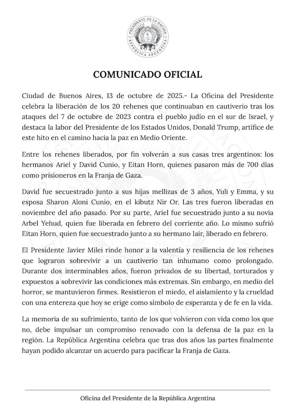 A través de un comunicado oficial publicado en la Oficina del Presidente, el Gobierno celebró la liberación de los 20 rehenes prisioneros en Gaza. Entre los liberados, se encuentran tres argentinos que volverán a su casa luego de estar 700 días detenidos.