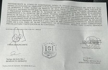 Según informó el medio local El Tribuno, la denuncia penal fue presentada horas más tarde en la Comisaría N° 101 de San Lorenzo por Carlos María García Bes. El vehículo en el que se trasladaban es una camioneta Toyota Hilux gris, propiedad de la empresa “Frigorífico del NOA S.A.”, cuyo titular es el propio Urtubey.