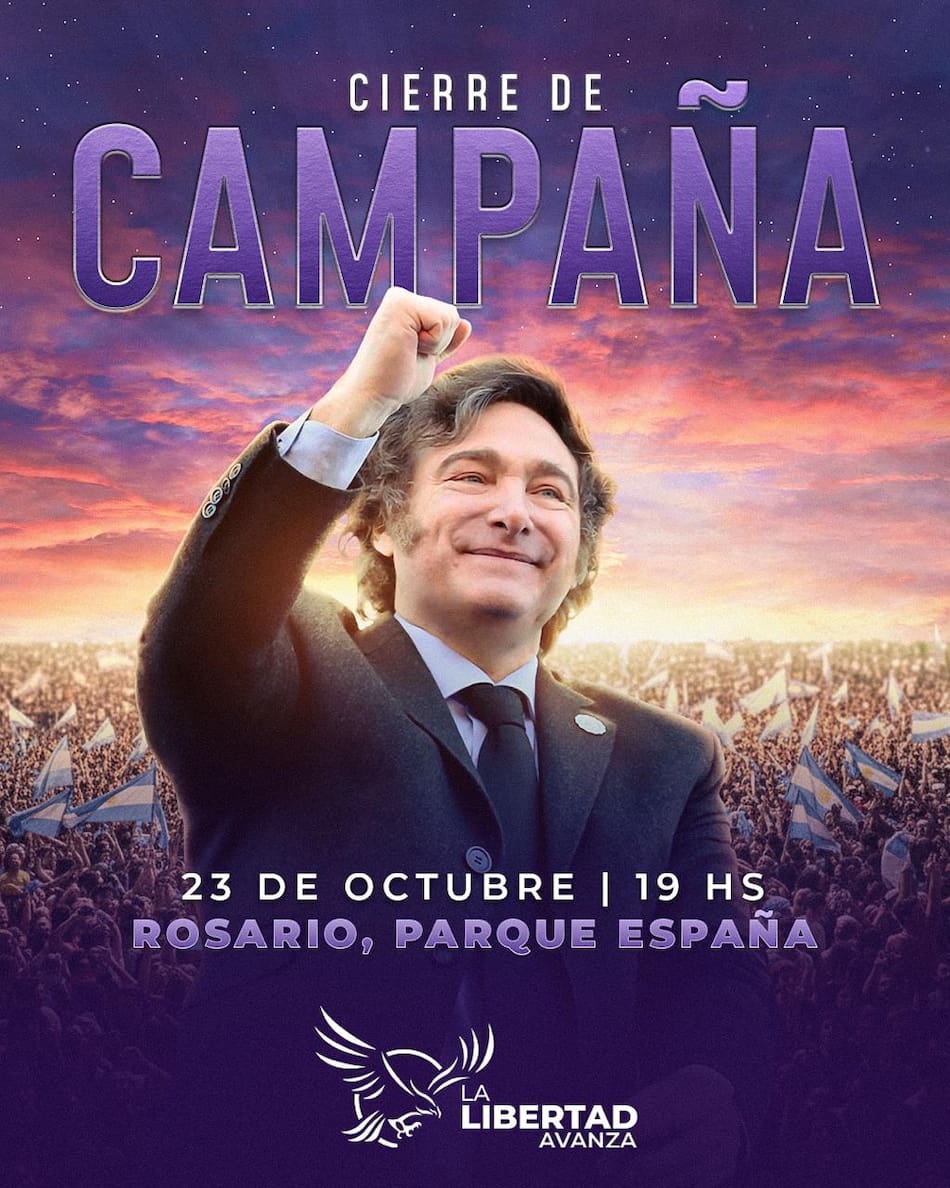 El jueves 23 de octubre, LLA dará por concluido el período proselitista en la ciudad de Rosario, donde buscan apuntalar en Santa Fe, una provincia clave en la que vaticinan un “empate técnico” con la lista que integran Caren Tepp y Agustín Rossi.