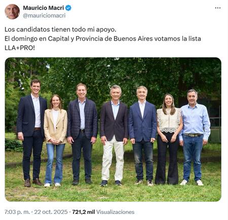 El ex presidente de Argentina pidió en sus redes sociales por el voto a la lista PRO-LLA en Provincia de Buenos Aires y CABA.