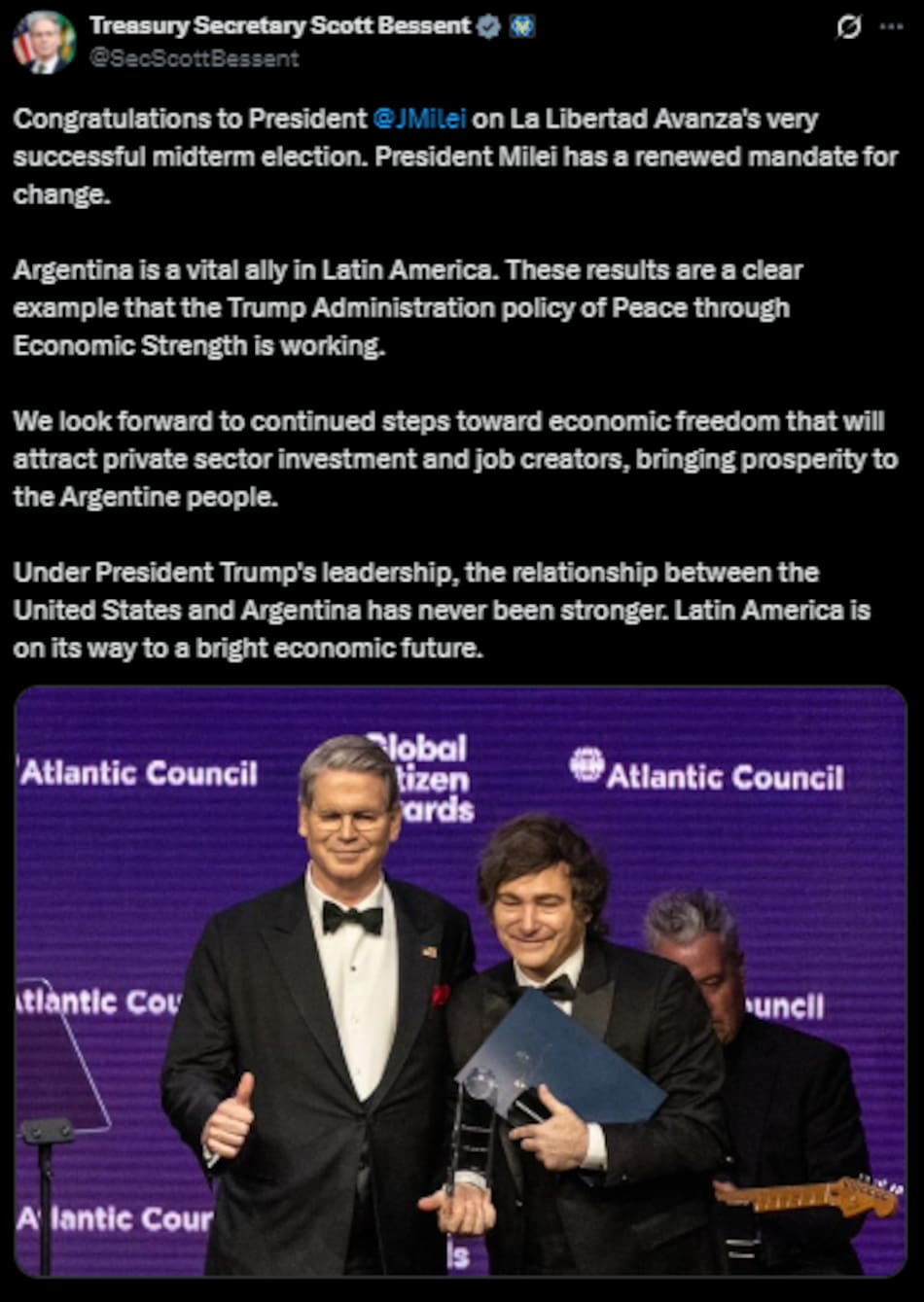 “Argentina es un aliado vital en América Latina. Estos resultados son un claro ejemplo de que la política de la Administración Trump de Paz a través de la Fortaleza Económica está funcionando” explicó Scott Bessent.