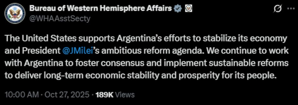 “Seguimos trabajando con la Argentina para fomentar el consenso e implementar reformas sostenibles que garanticen la estabilidad económica y la prosperidad a largo plazo de su población”, expresó la Oficina de Asuntos del Hemisferio Occidental del Gobierno de Estados Unidos en un posteo de la red social X.