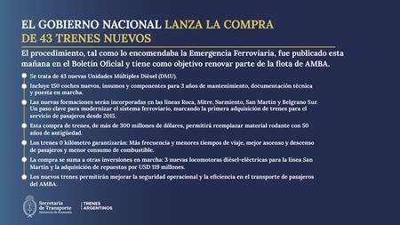 El Gobierno Nacional anunció la compra de 43 trenes nuevos en el marco de la Emergencia Ferroviaria. Tiene como objetivo renovar parcialmente la flota de los vehículos en el Área Metropolitana de Buenos Aires (AMBA).