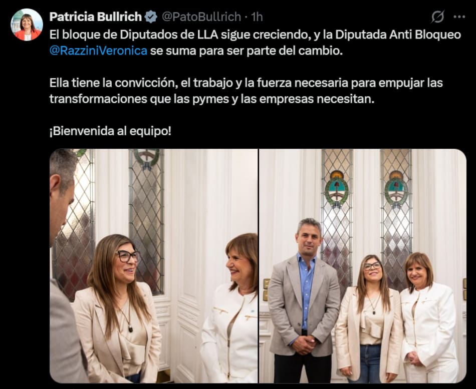 Quien le dio la bienvenida en redes sociales a la diputada “Anti Bloqueo” con origen en el PRO fue la senadora electa Patricia Bullrich, que pese a pertenecer a la otra cámara ya empieza a moverse como jefa de todo el esquema libertario en el Congreso.