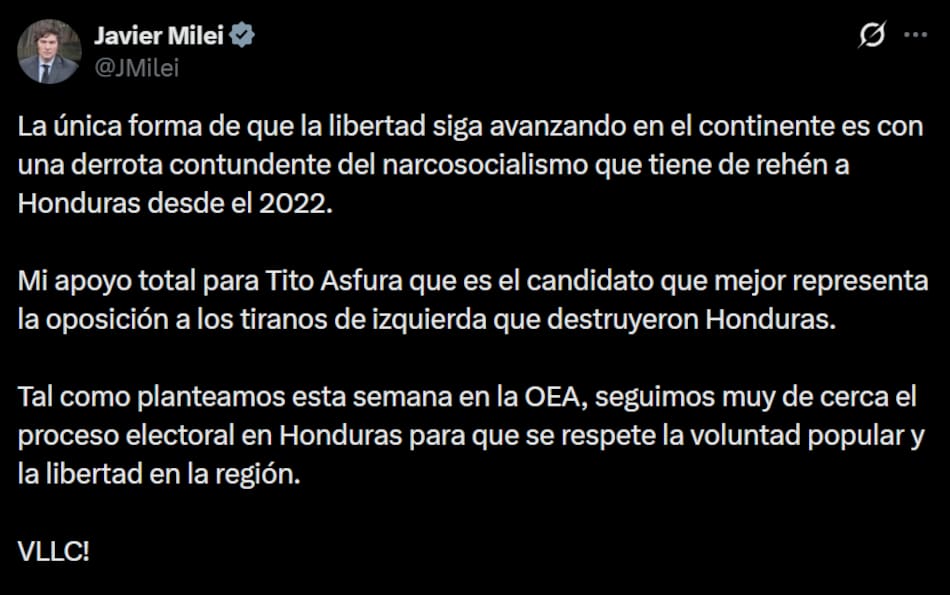 En ese marco, Milei sostuvo: “Mi apoyo total para Tito Asfura que es el candidato que mejor representa la oposición a los tiranos de izquierda que destruyeron Honduras”.