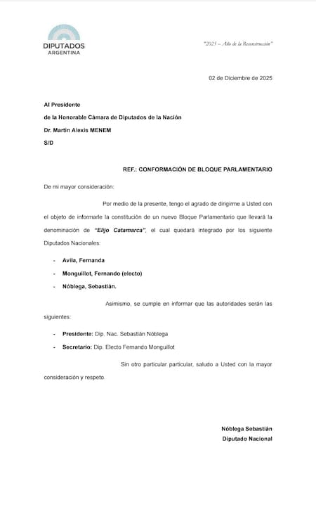 Ávila, Nóblega y el electo Monguillot firmaron la carta enviada al presidente de la Cámara Baja, Martín Menem, en la cual indican que el segundo de ellos asumirá la presidencia de la nueva bancada.