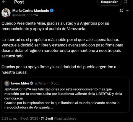 Días atrás, Milei había recibido una invitación personal por parte de Machado, quien recibirá la distinción internacional el miércoles 10 de diciembre a las 09:00 (hora argentina), en una ceremonia que contará con la presencia de otros tres jefes de Estado latinoamericanos.