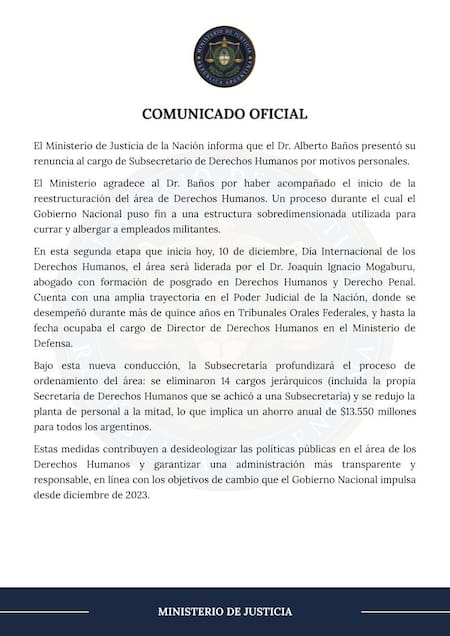 “El Ministerio de Justicia de la Nación informa que el Dr. Alberto Baños presentó su renuncia al cargo de Subsecretario de Derechos Humanos por motivos personales.