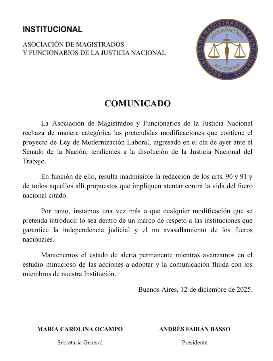 Según los jueces, ciertos artículos plantean problemáticas “tendientes a la disolución de la Justicia Nacional del Trabajo”. El comunicado fue firmado por el juez Andrés Basso y la secretaria María Carolina Ocampo.