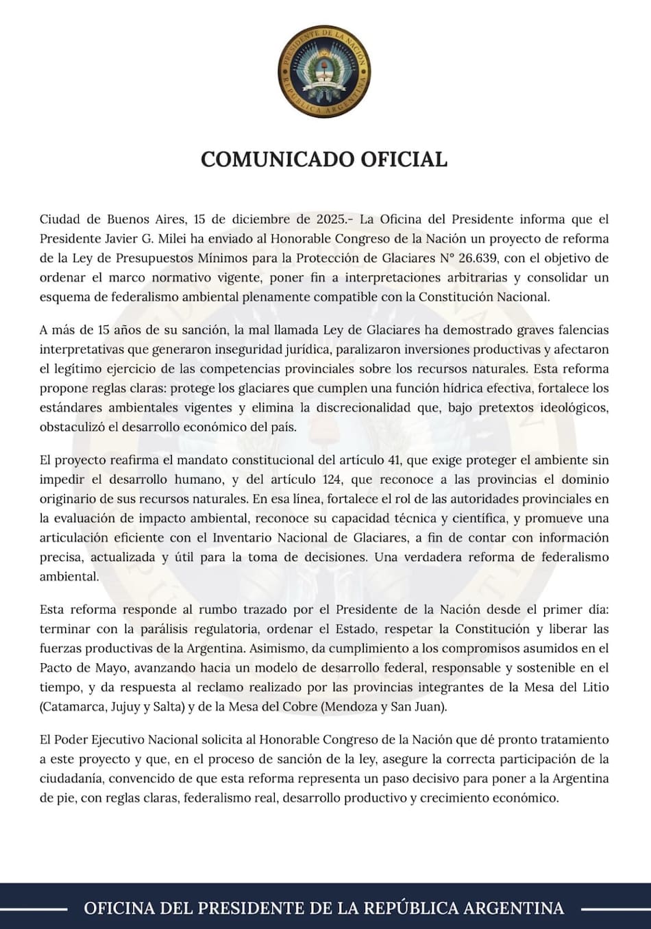 La Oficina del Presidente informa que el Presidente Javier G. Milei ha enviado al Honorable Congreso de la Nación un proyecto de reforma de la Ley de Presupuestos Mínimos para la Protección de Glaciares N° 26.639, con el objetivo de ordenar el marco normativo vigente, poner fin a interpretaciones arbitrarias y consolidar un esquema de federalismo ambiental plenamente compatible con la Constitución Nacional.