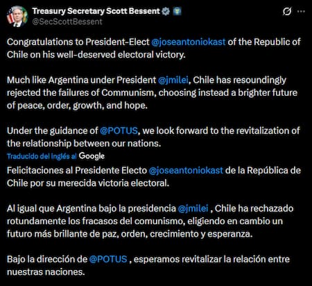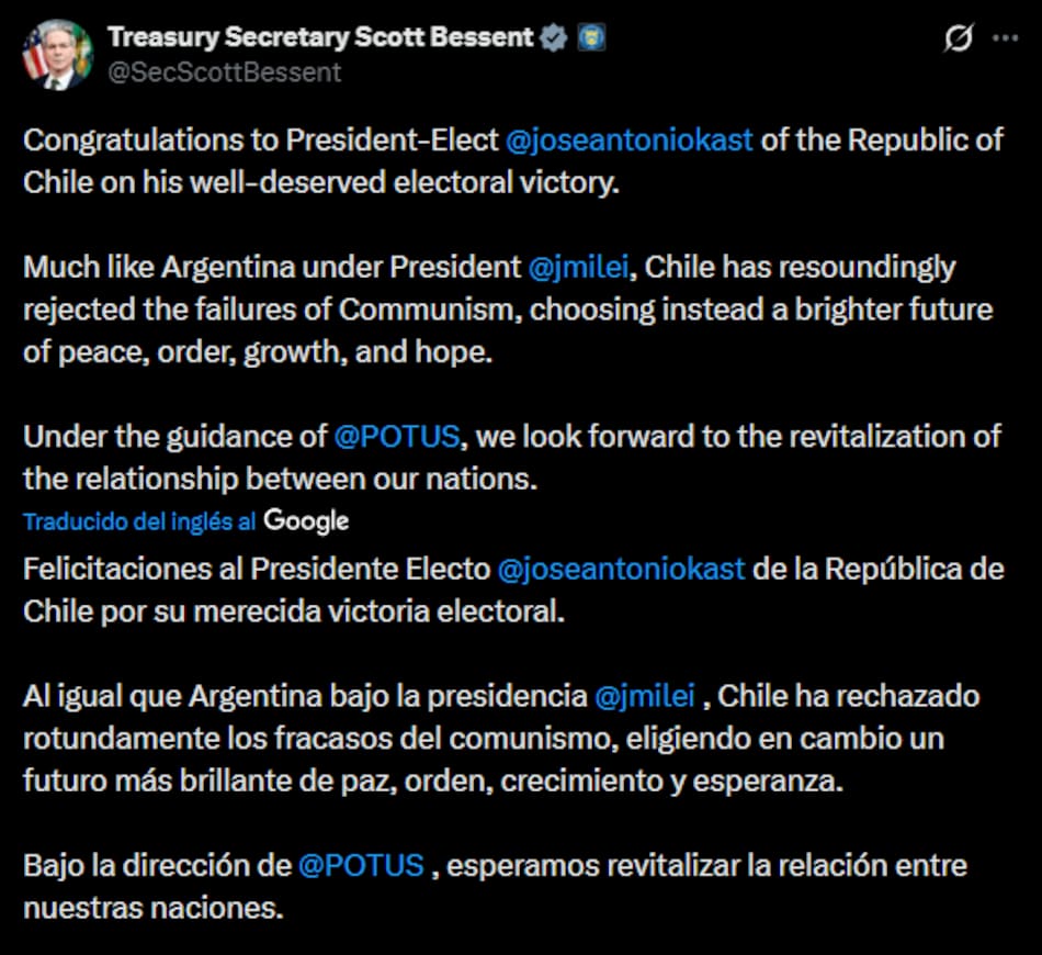 “Felicitaciones al presidente electo José Antonio Kast de la República de Chile por su bien merecida victoria electoral”, expresó Bessent en un mensaje publicado en su cuenta oficial. Pero eso no es todo: comparó al futuro mandatario chileno con Javier Milei.