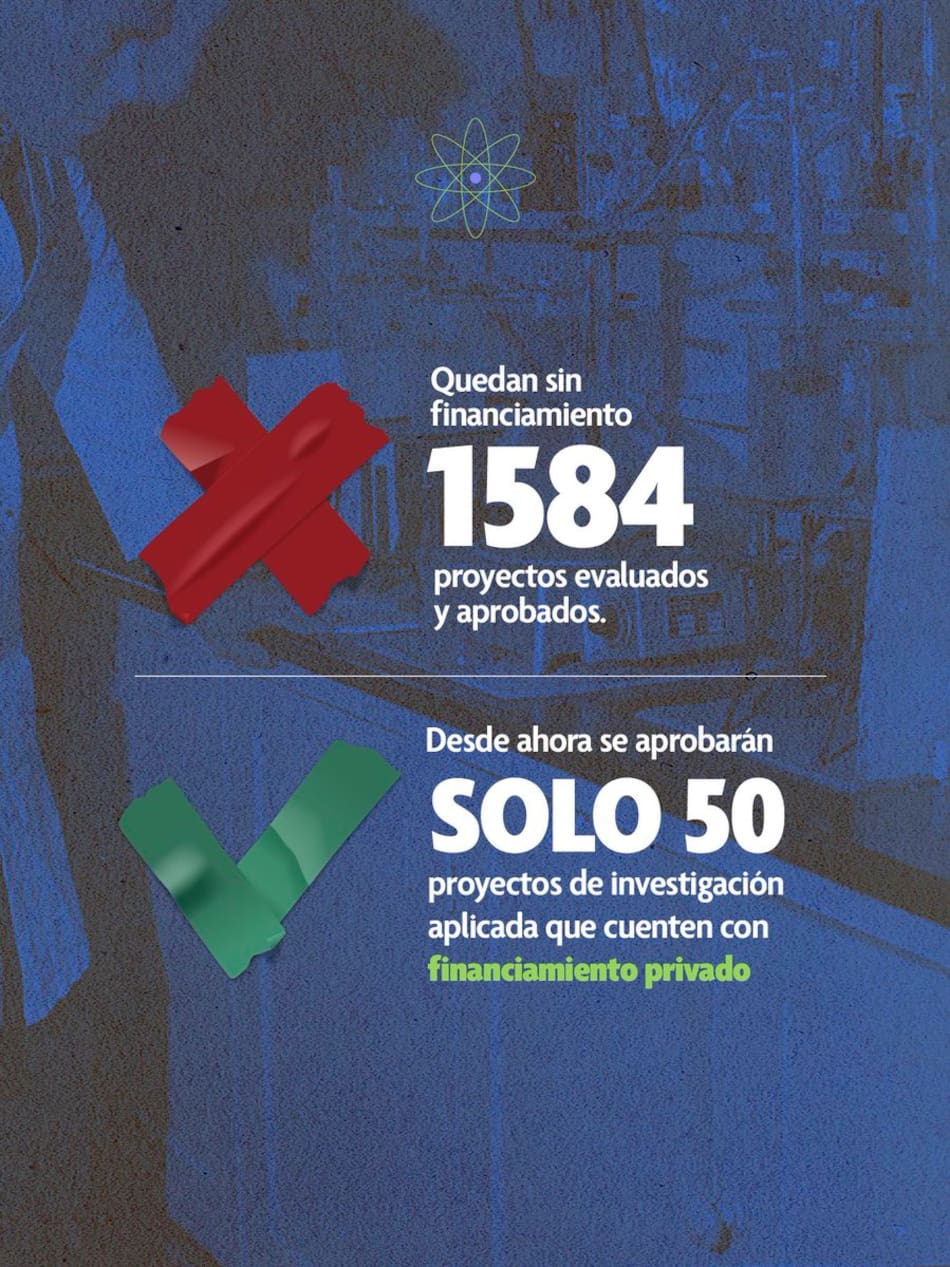 Sumaron una imagen con datos de proyectos aprobados y evaluados, diciendo que desde ahora “se aprobarán solo 50 proyectos de investigación que cuenten con financiamiento privado”. Y la CONADU sentenció: “Con esta decisión, Argentina deja de financiar la ciencia básica, la etapa temprana del conocimiento. Y sin ciencia básica no hay ciencia aplicada”.